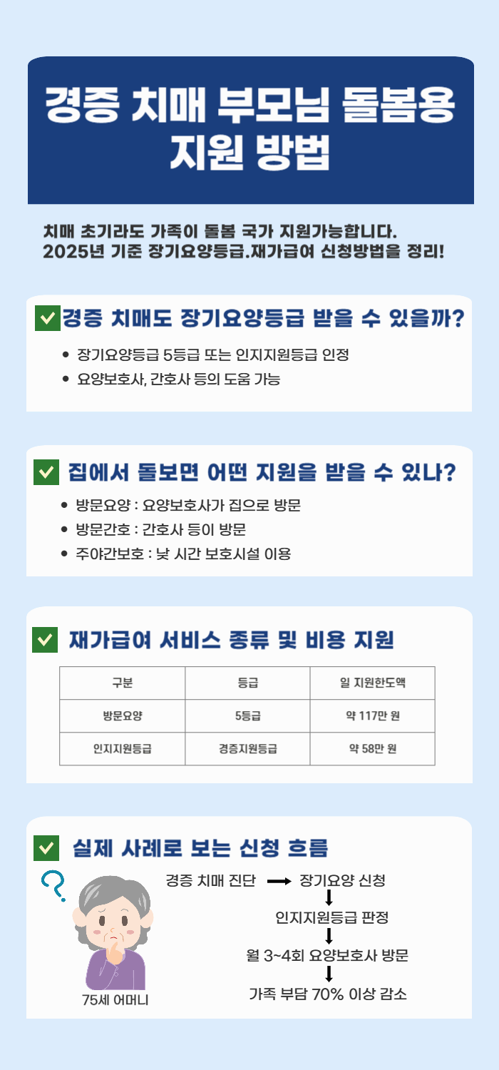 부모님이 치매 초기 단계라 시설 입소는 아직 어렵고, 집에서 돌봐야 하는 상황이라면?이럴 땐 국민건강보험공단을 통해 ‘재가급여’ 서비스를 신청할 수 있습니다.2025년 기준으로 바뀐 장기요양등급 기준과 돌봄비 지원 방법을 정리했습니다.📌 이 글의 목차경증 치매도 장기요양등급 받을 수 있을까?집에서 돌보면 어떤 지원을 받을 수 있나?장기요양등급 신청 절차 (2025년)재가급여 서비스 종류 및 비용 지원월 최대 얼마까지 지원받을 수 있나?실제 사례로 보는 신청 흐름 ✅ 경증 치매도 장기요양등급 받을 수 있을까?경증 치매여도 인지기능이 일정 수준 이하라면 장기요양 5등급 또는 인지지원등급을 받을 수 있습니다.단, 신체기능 저하가 없는 경우에는 1~4등급이 아닌 5등급 또는 인지지원등급으로 분류됩니다.✅ 집에..