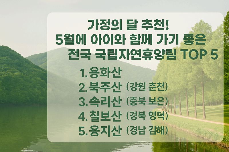 가정의 달 추천! 5월에 아이와 함께 가기 좋은 전국 국립자연휴양림 TOP 5🌲 “5월 가족 나들이 어디로 갈까 고민 중이신가요?” 자연 속에서 아이들과 힐링할 수 있는 국립자연휴양림 추천지 TOP 5를 모았습니다. 숲 놀이터, 산림 체험, VR 가상현실까지 아이들이 신나게 뛰어놀고 부모님은 쉼을 즐길 수 있는 최고의 장소들! 올봄엔 자연 속으로 떠나보세요 🚗안녕하세요 😊 매년 5월 가정의 달이면 어디로 가족 여행을 갈지 고민이 많으시죠? 숲 속 놀이터, 인공암벽 등반, 실내 체험관 등 아이들이 좋아할 만한 프로그램이 많아서 추천드리고 싶어요. 이번 글에서는 아이와 가기 좋은 국립자연휴양림 TOP 5를 꼼꼼히 정리했으니 가족 여행 준비하시는 분들께 큰 도움이 될 거예요 🌿📌 목차1. 용화산자연..